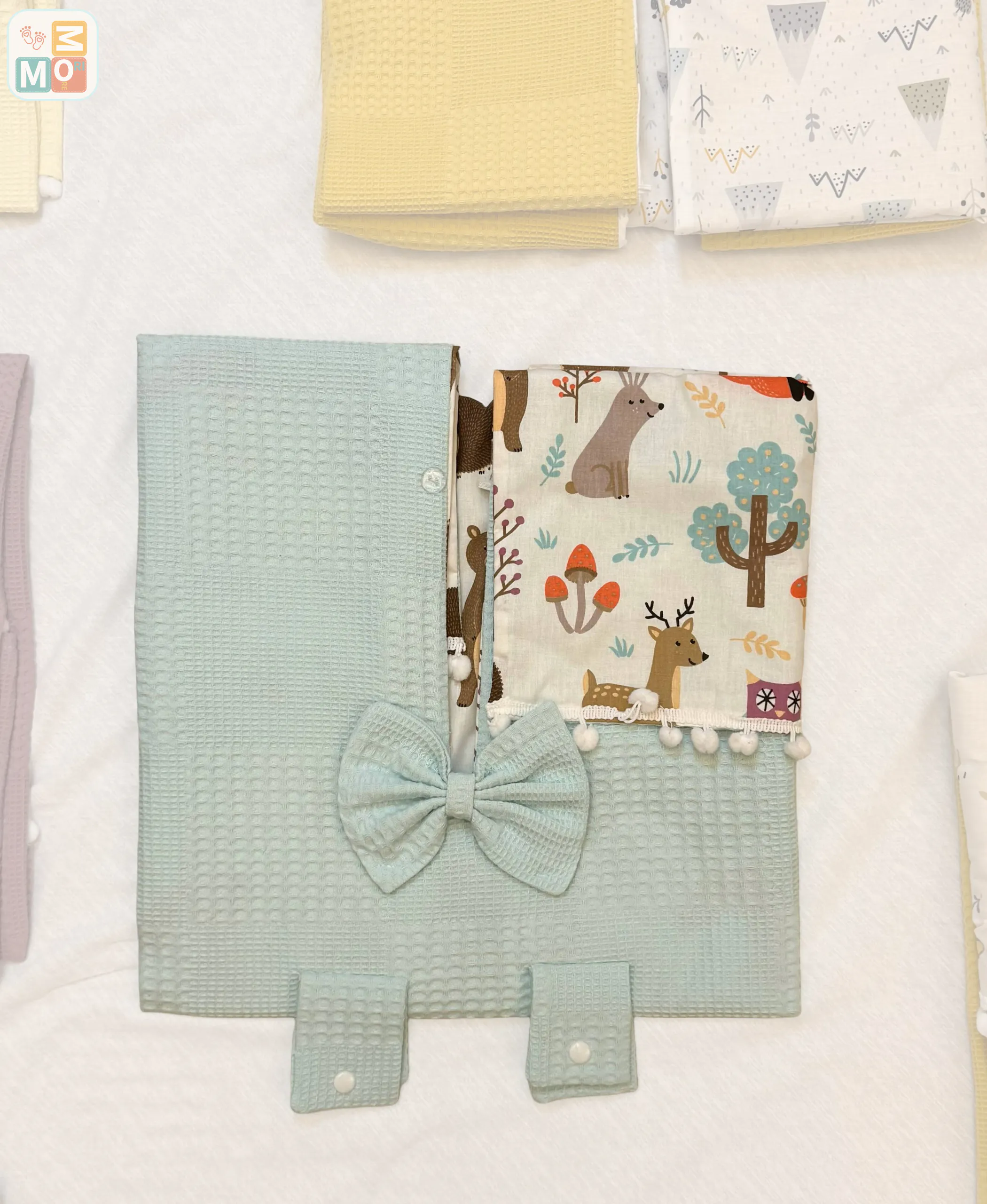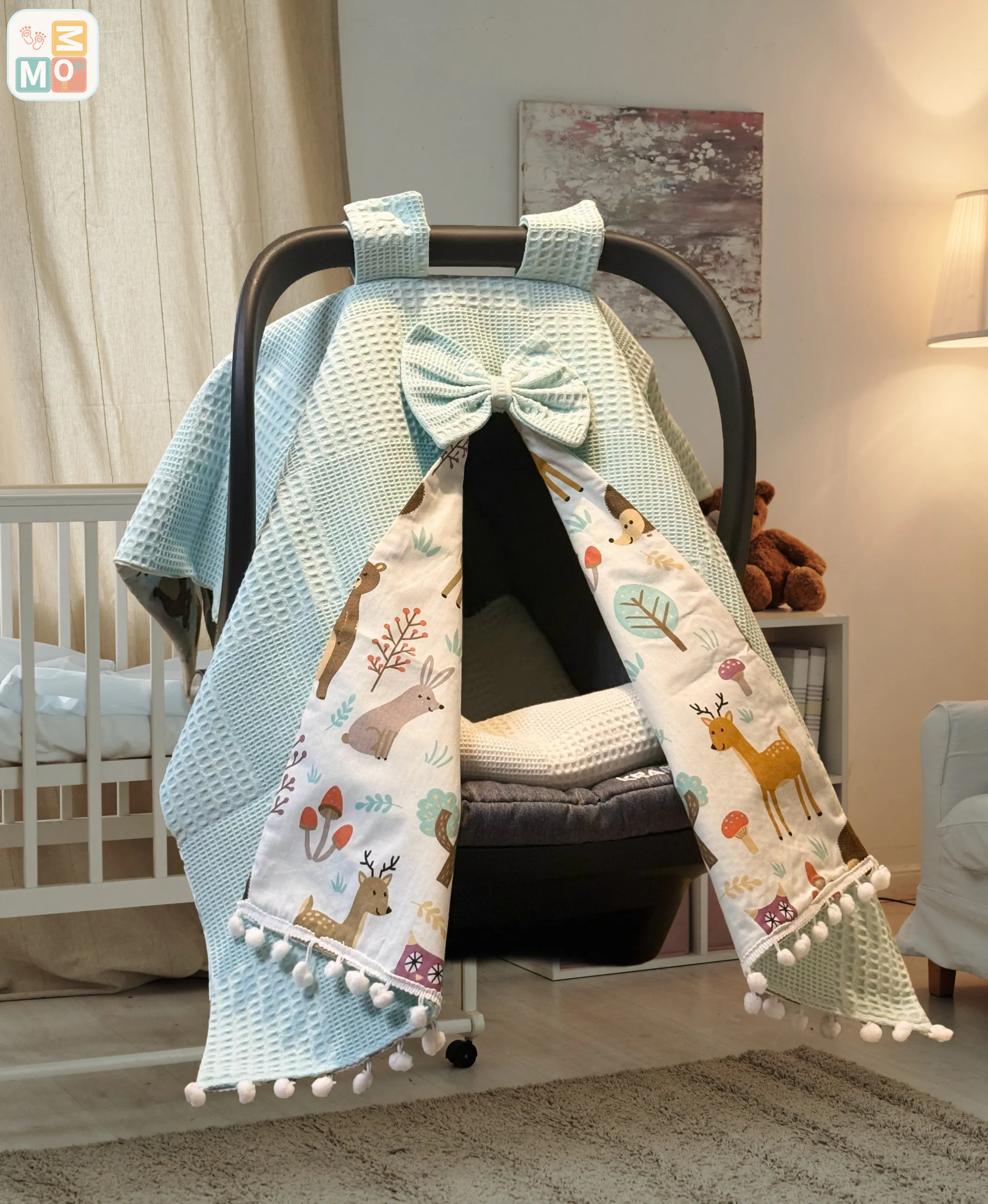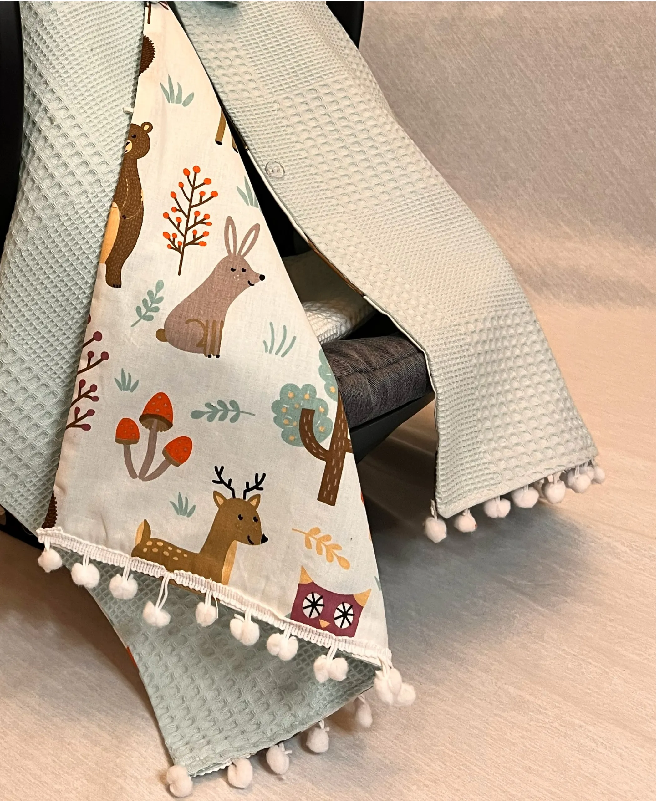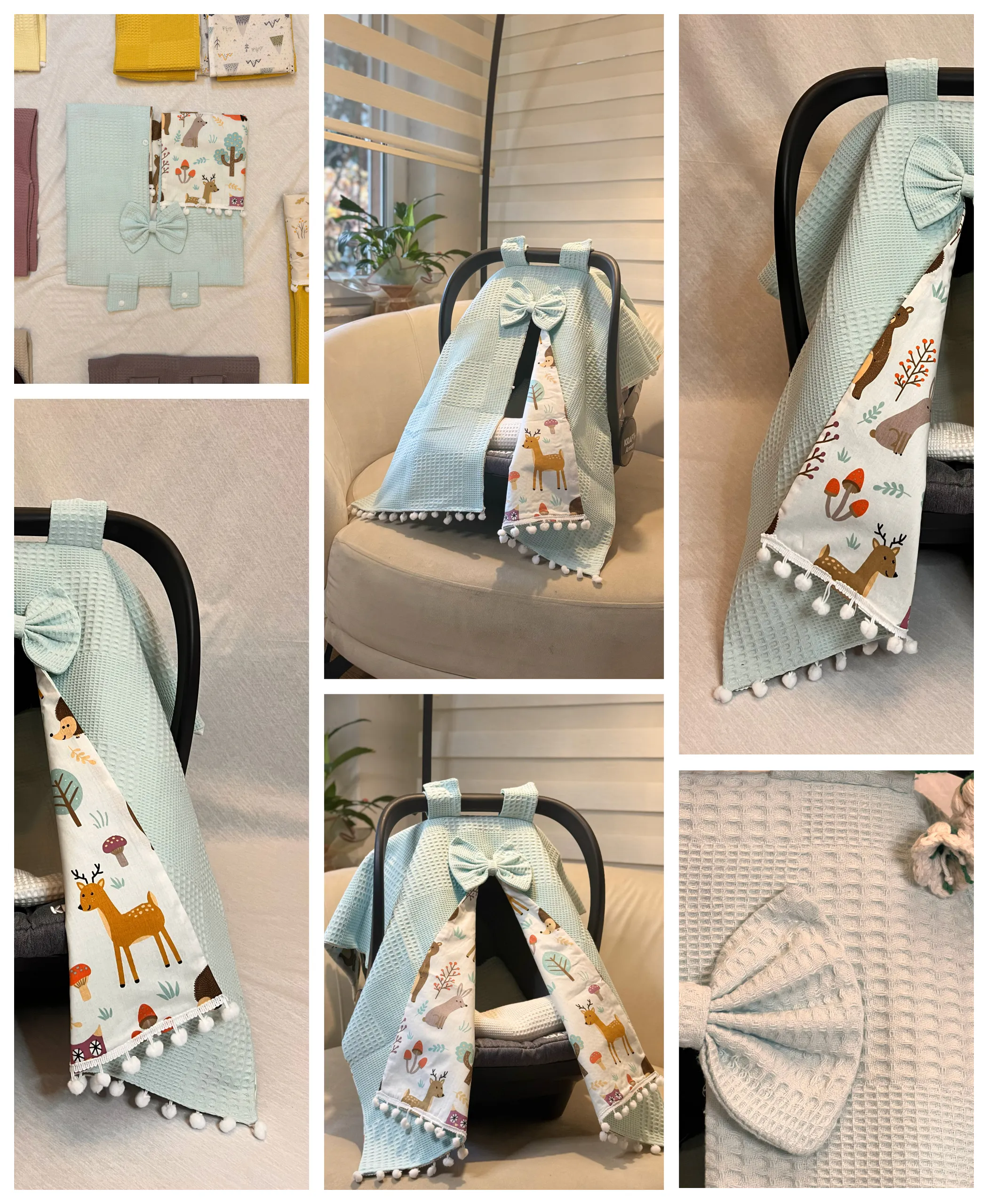 Focus: aqua blue baby car seat cover | waffle + poplin stroller canopy | deer pattern | optional pram liner