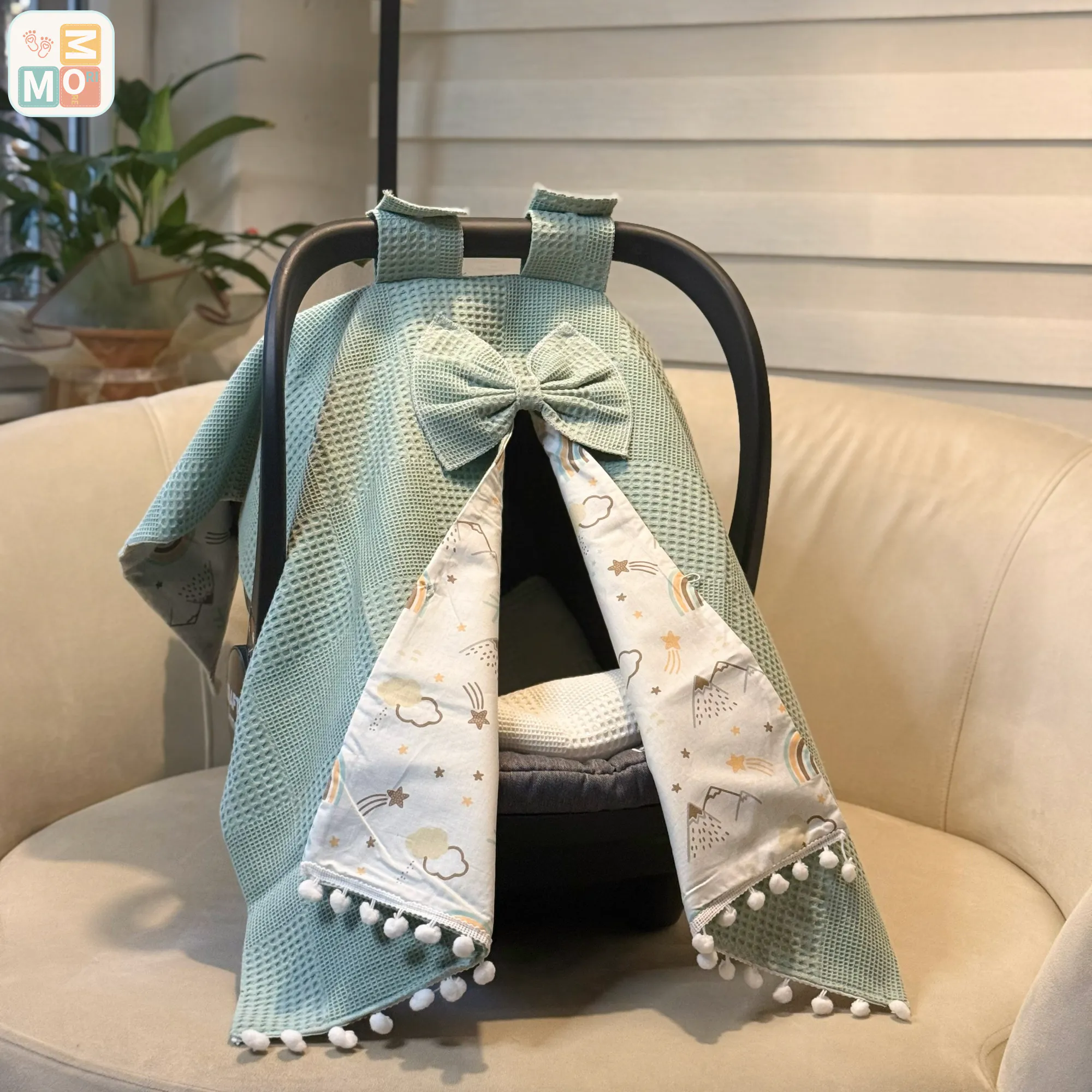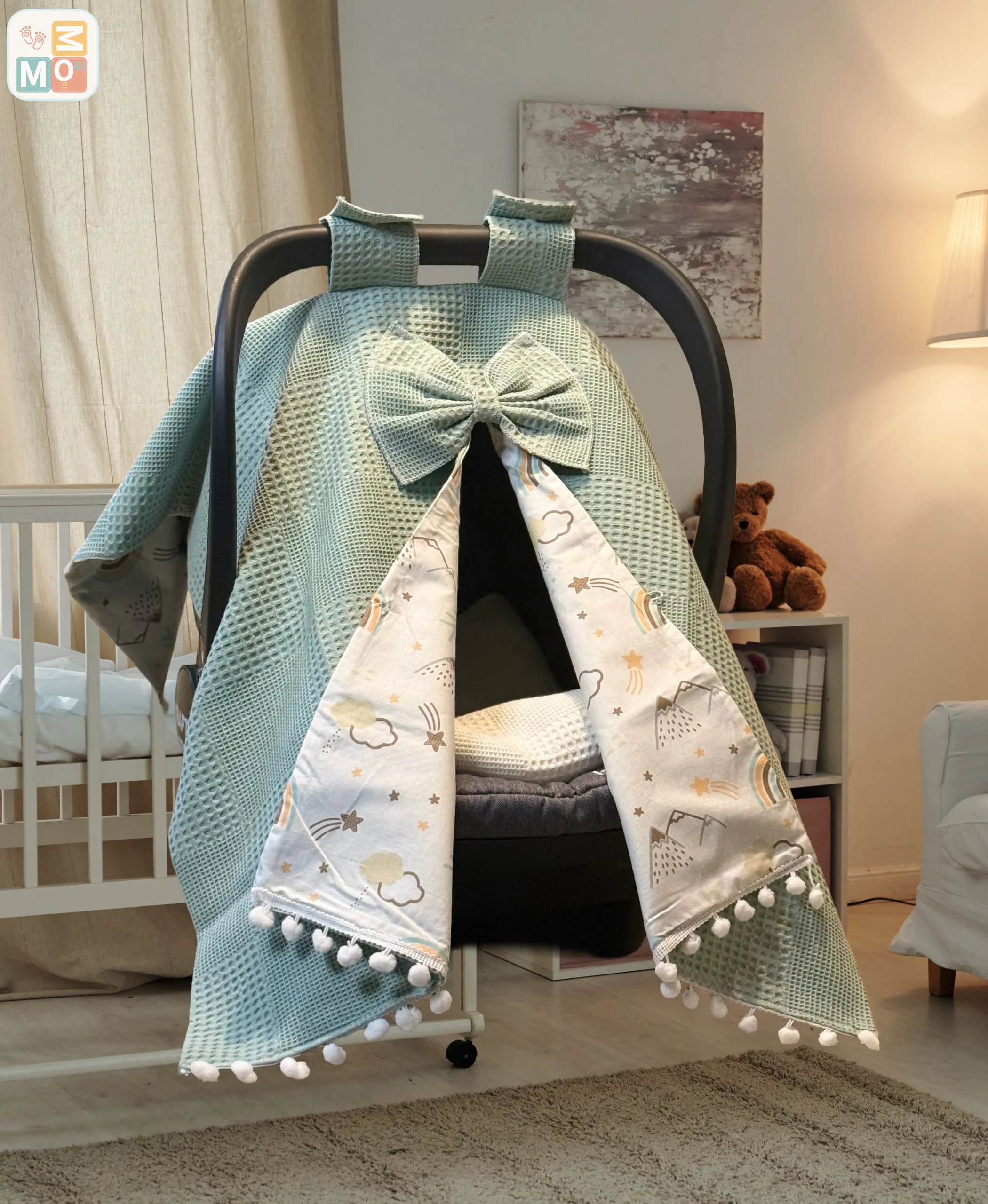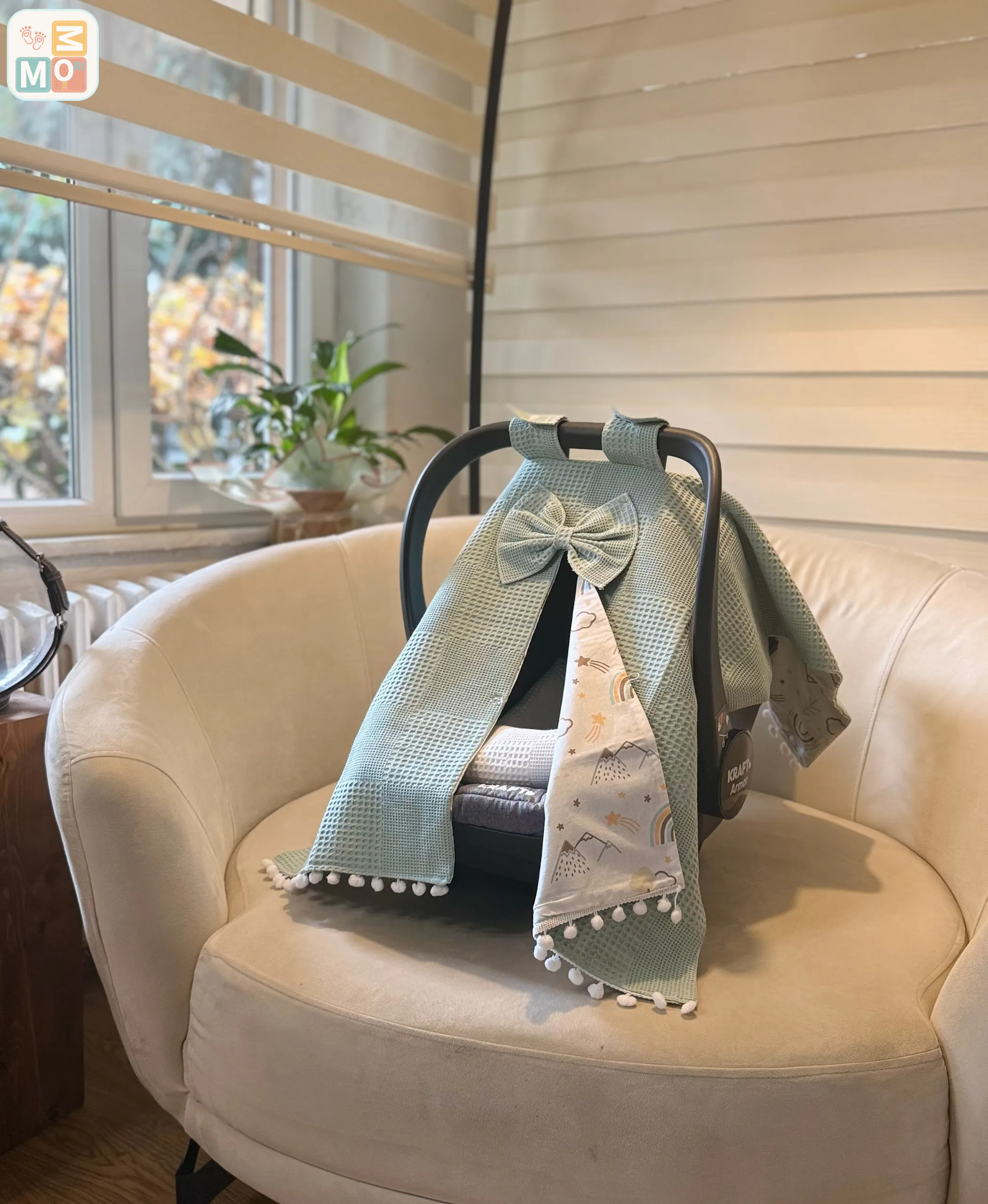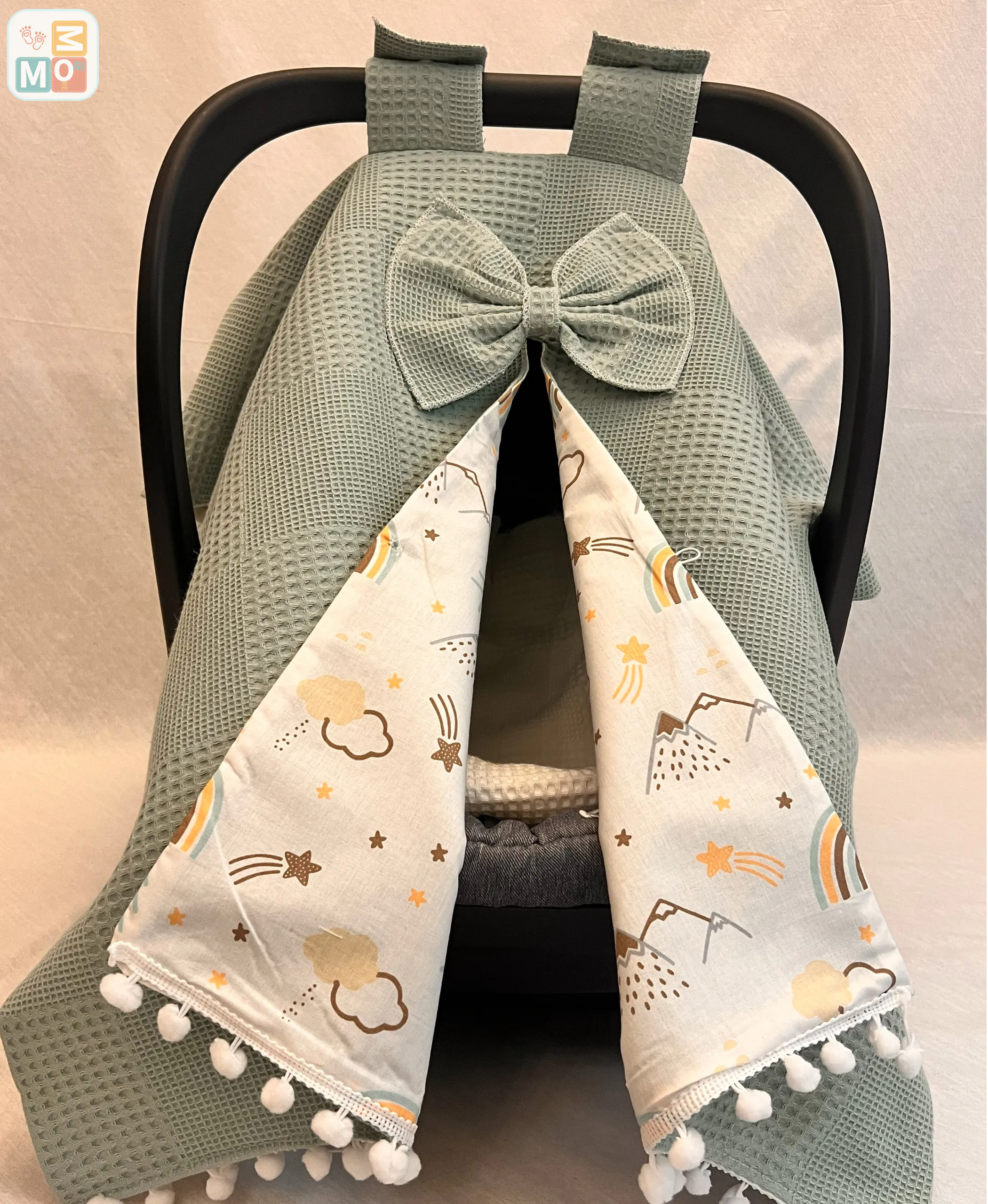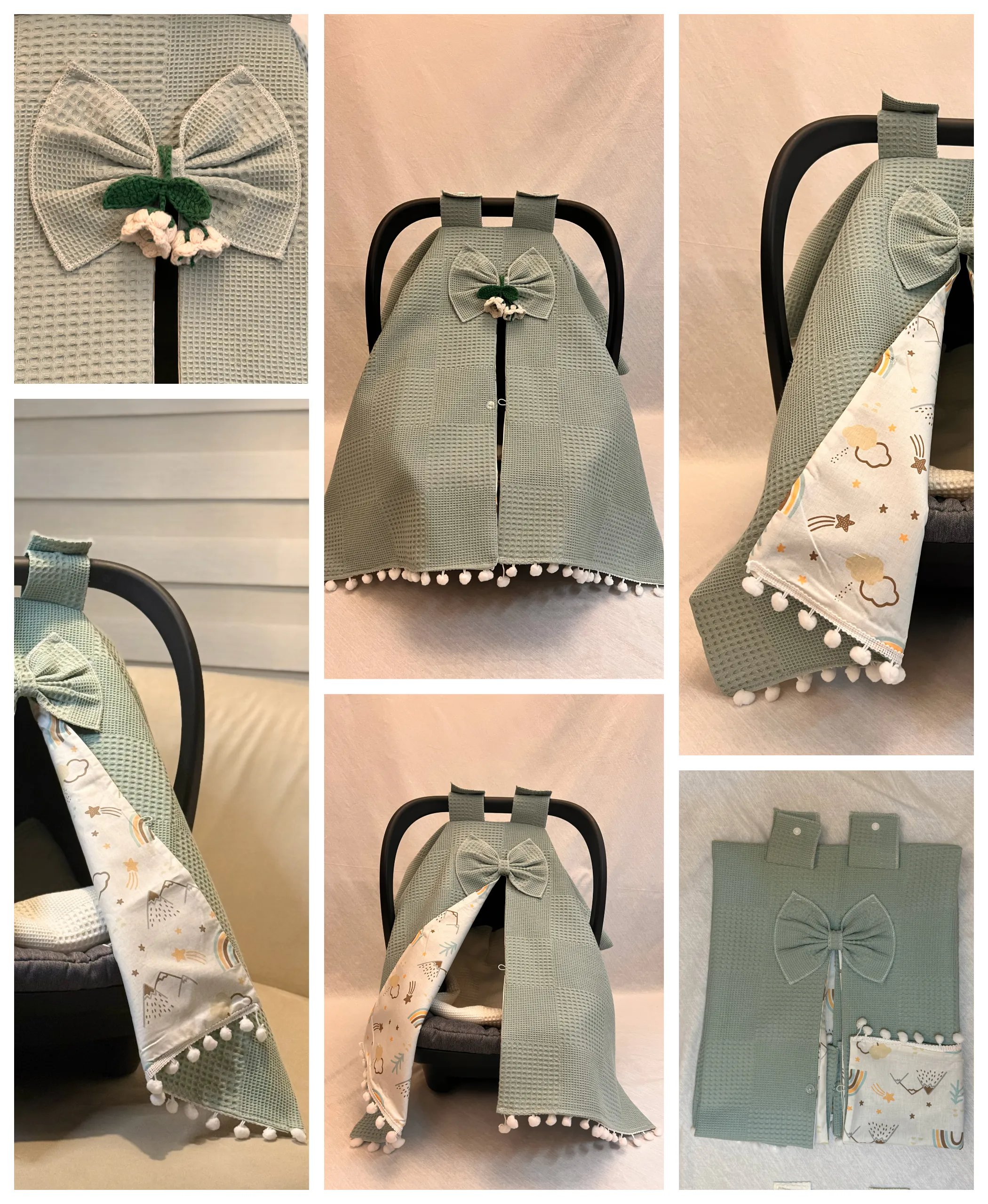 Protect your baby in style with this handcrafted patina blue cotton baby car seat canopy, designed to offer comfort, privacy, and gentle protection during fall, winter, and transitional seasons. Made from breathable waffle cotton and paired with a soft inner poplin layer, this cover keeps your baby cozy while allowing natural airflow. This design helps shield your little one from wind, light cold, outside contact, and curious looks, creating a calm and secure environment whether you’re on a walk or running daily errands. Crafted with a double-layer cotton structure, the outer layer features textured waffle cotton, while the inner side is made from printed poplin cotton selected to perfectly complement the waffle color. Choose your inner poplin print: keep the default rainbow print shown in the photos or choose a different poplin print from the options presented in the listing images. Multiple pattern choices are available to personalize the look according to your preference. The front opening is finished with a decorative bow detail and can be easily closed with a button, allowing quick access to your baby whenever needed. The fabric texture is extremely soft and made from first-quality cotton, suitable for everyday use. Optional add-on: an optional pram, stroller, or car seat liner cushion can be purchased together with this canopy. The liner is made from poplin cotton and filled with soft pillow fiber. If you select this option, please specify whether you would like the liner in plain white or the same poplin pattern as the inner canopy fabric. Personalization: name or word embroidery is available and finished in green thread, making this piece a meaningful keepsake or a thoughtful baby shower gift. If you would like to purchase this car seat canopy together with a matching baby bedding set, please contact us before placing your order to request a special discount coupon for both products. When purchased together, we can create both items using the same waffle cotton color and the same inner poplin pattern, ensuring a perfectly coordinated and harmonious look.