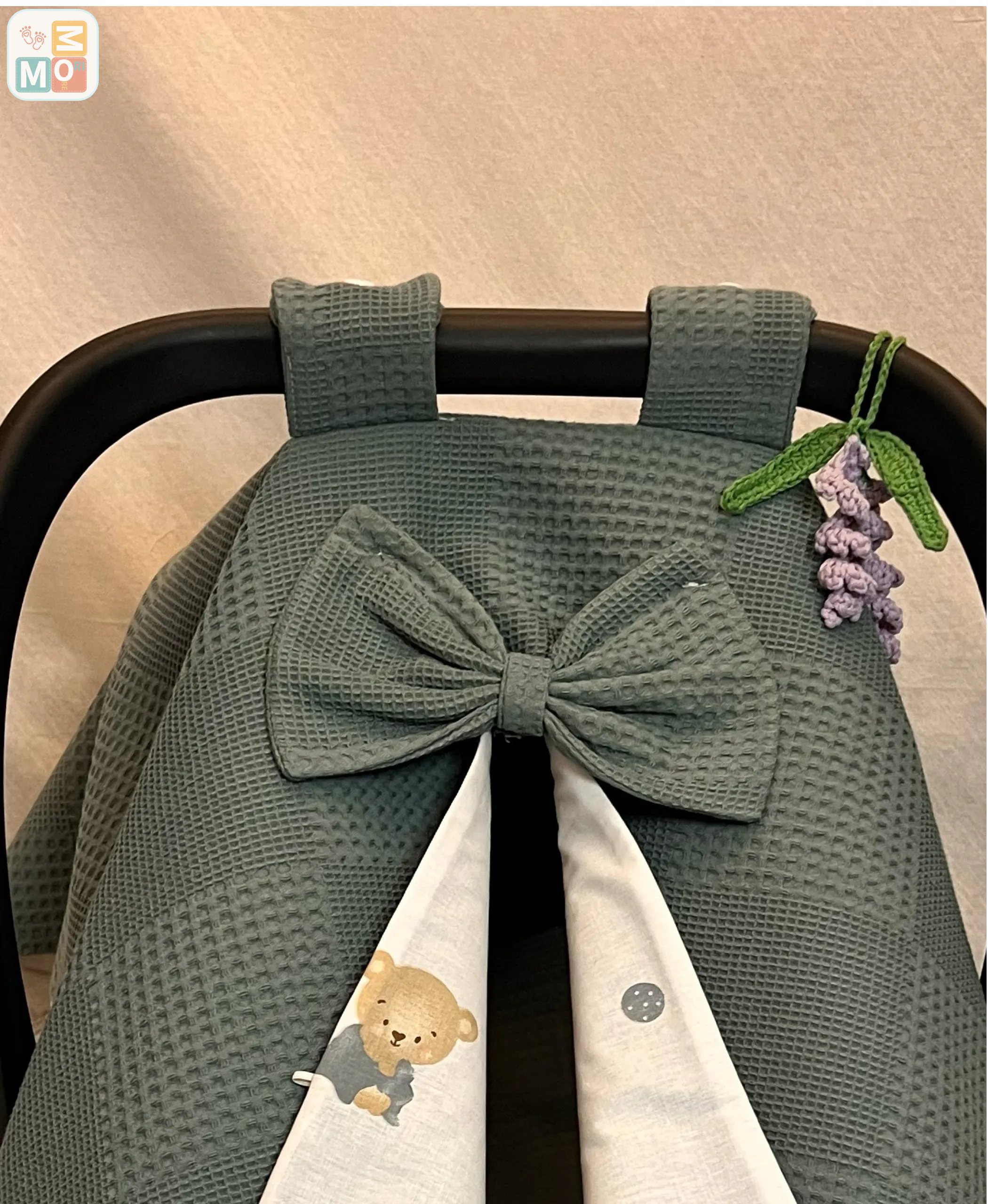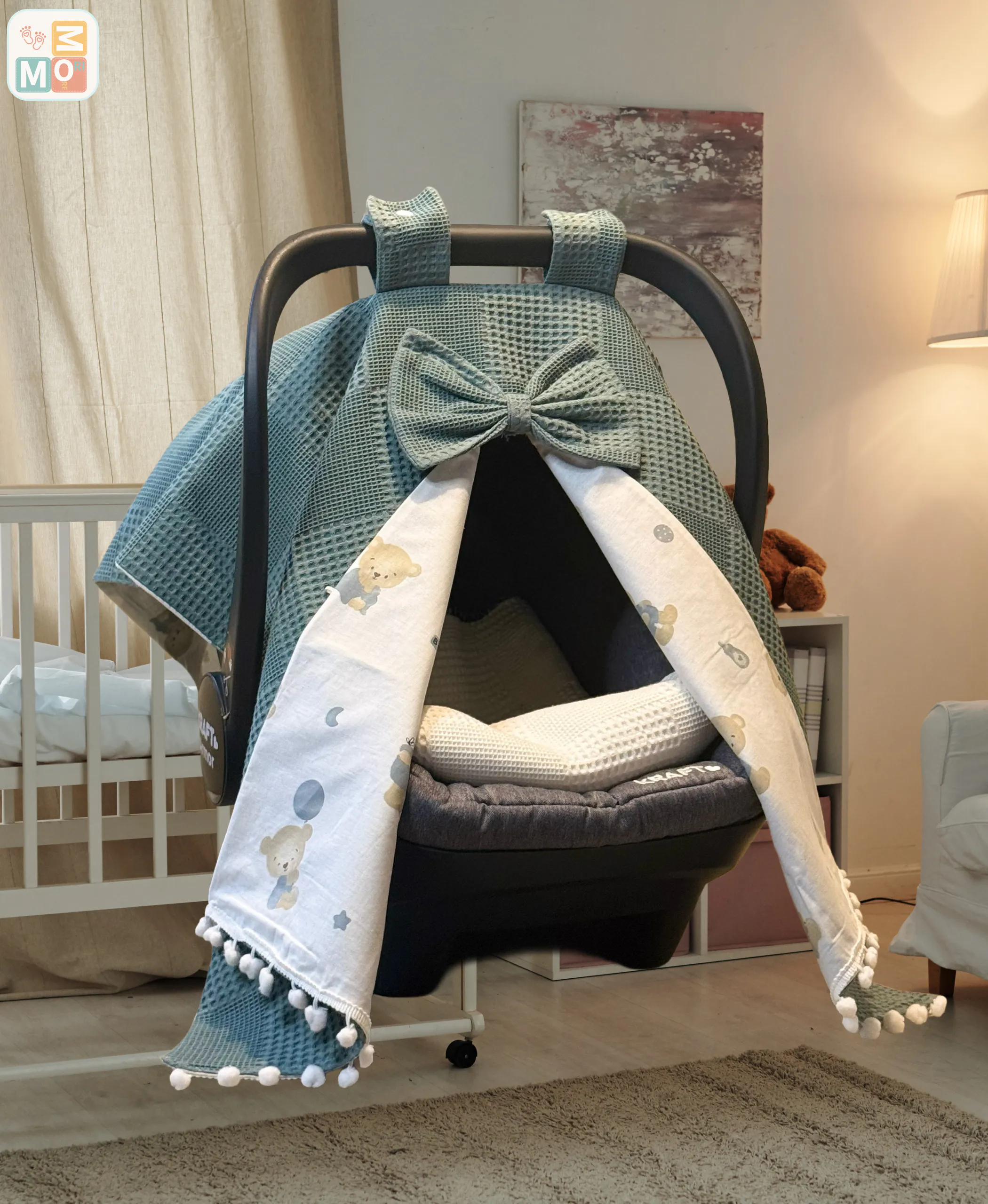 Focus: petrol green baby car seat cover | waffle + poplin stroller canopy | bear pattern | blue copper embroidery | optional pram liner