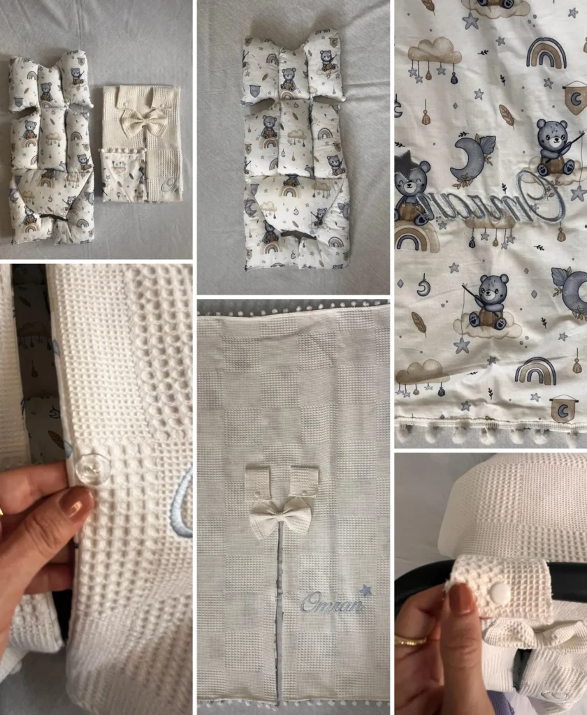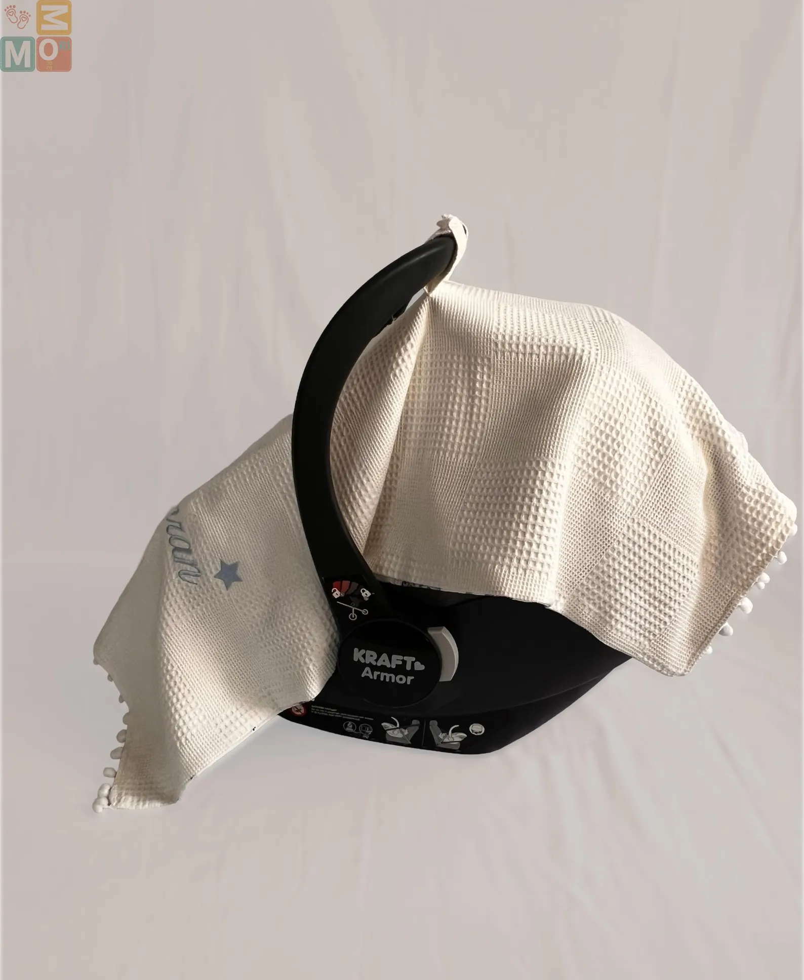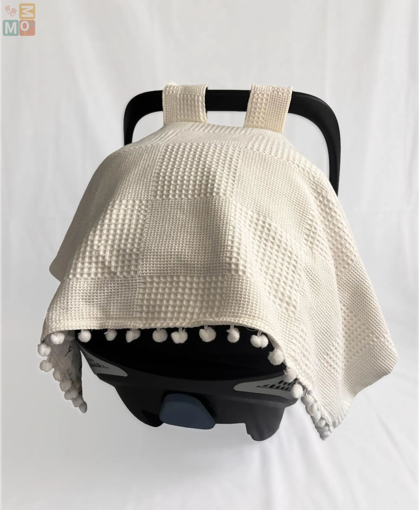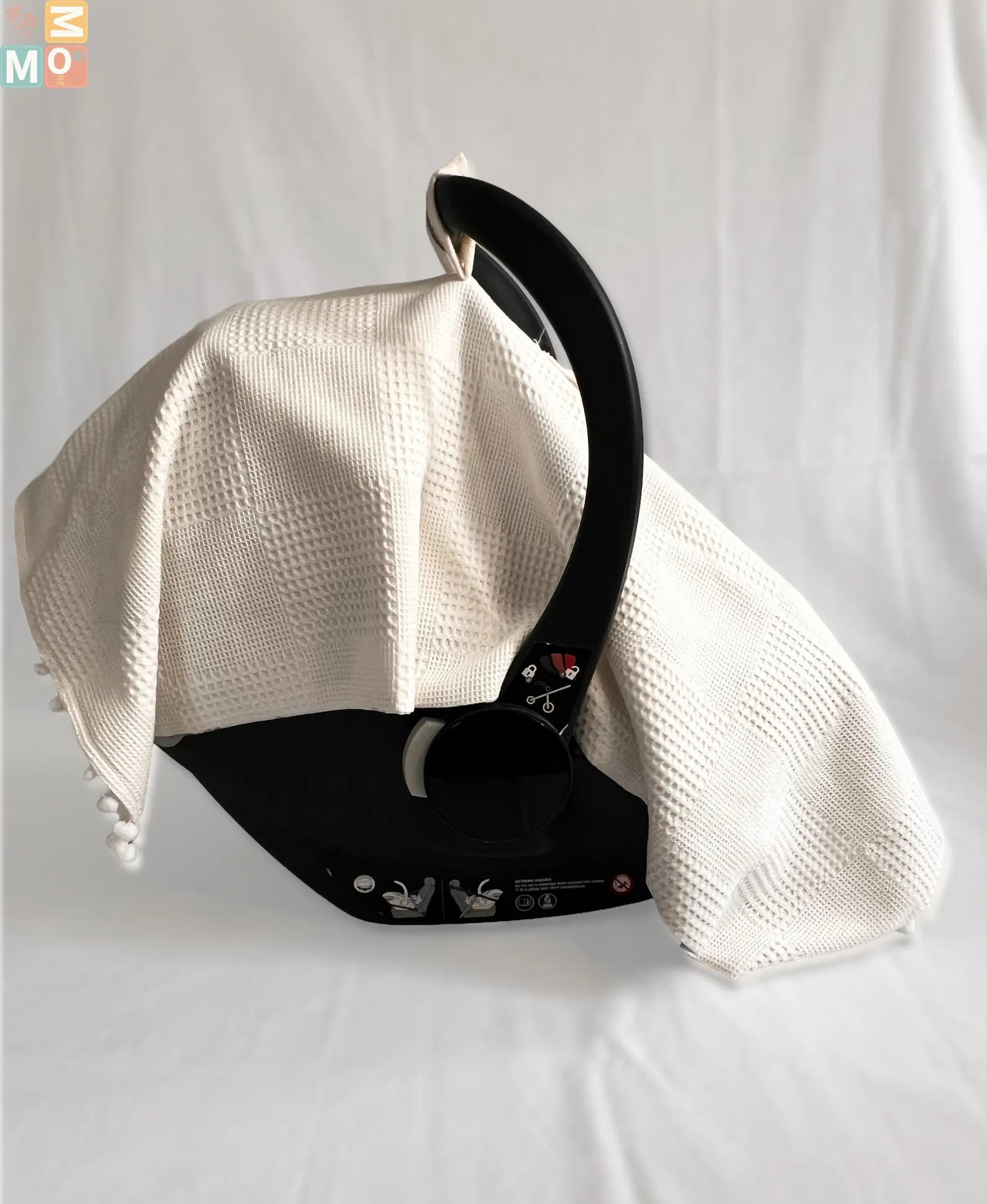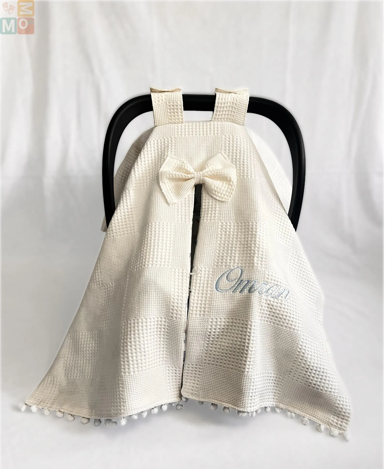 Handmade cotton baby car seat cover & canopy. Universal-friendly, button closure, cozy privacy. Optional pram liner + personalization. MN-OFFWITE-OMAR-3