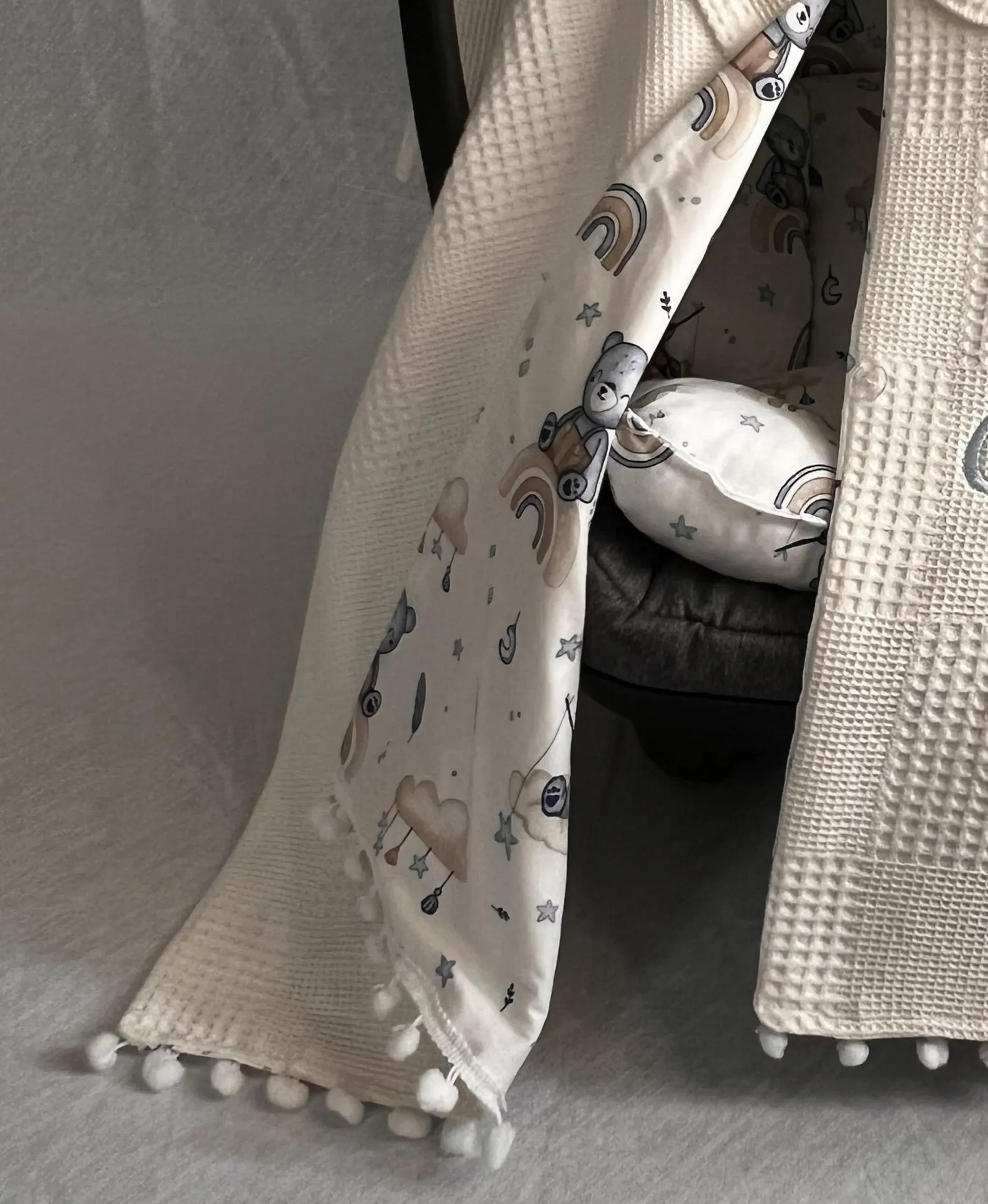 Made from 100% cotton in calm cream, beige, and blue tones, the design features sweet teddy bears, clouds, moons, stars, and rainbows, creating a soothing and storybook-inspired look from the very first days.